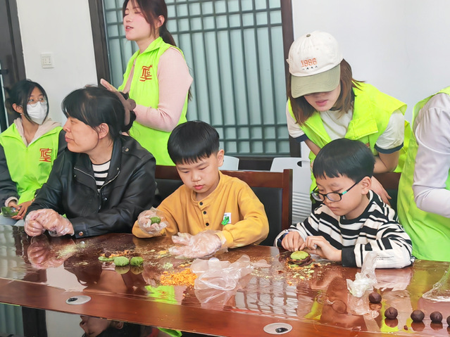 首先,志愿者以青团为切入点,向社区儿童介绍了清明节的来源以及扫墓、踏青等传统习俗。随后,志愿者为社区儿童讲解青团制造过程,并与儿童一起搓团、包馅、揉捏、包团。不多时,一个个青团便呈现在大家的眼前,虽大小不一,但圆润可爱。蒸熟后的青团油绿如玉、糯韧绵软、清香爽口。小朋友们带着亲手制作的独家青团,与家人一起分享这份独特的清明记忆。