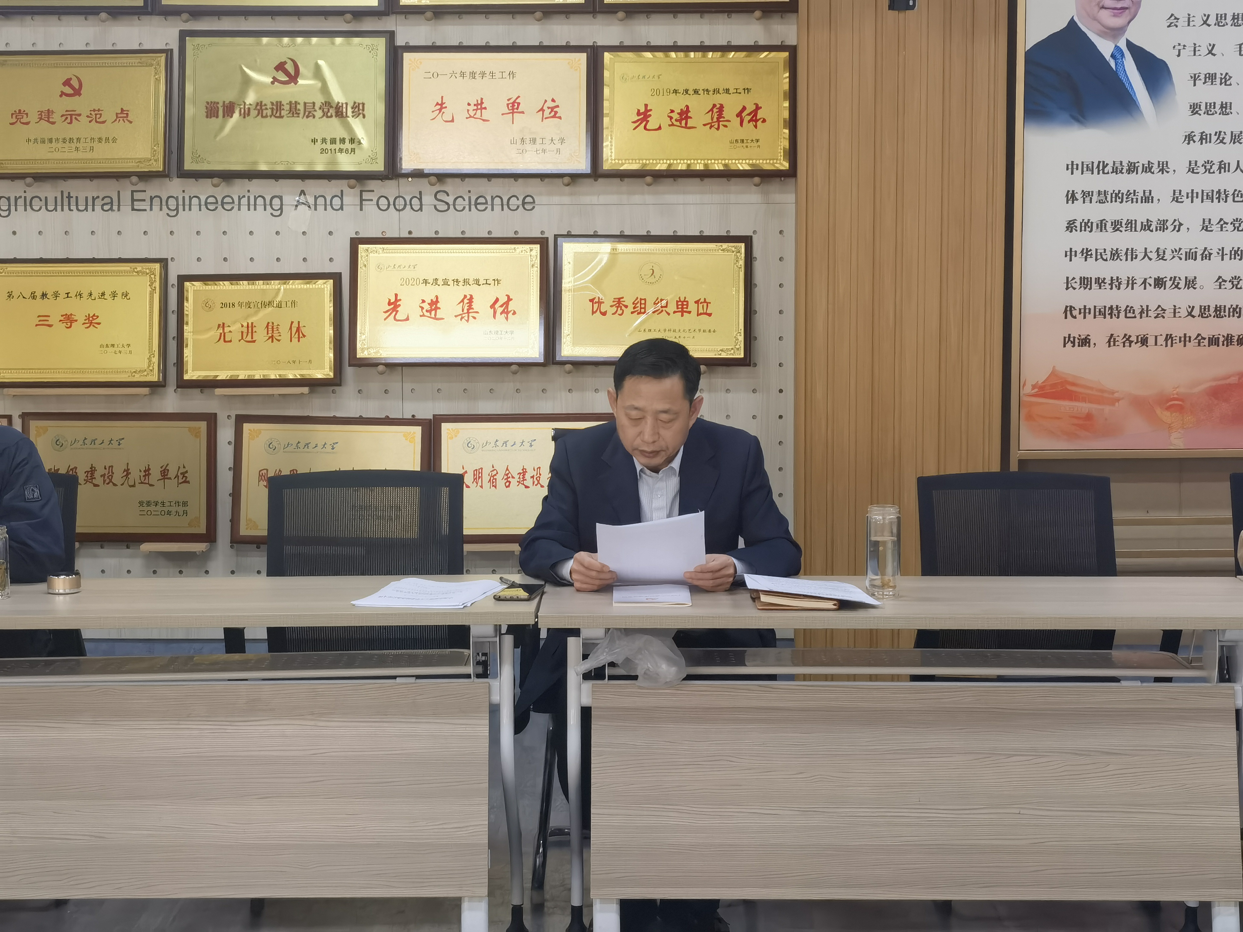 会上集体学习了《中共中央办公厅关于在全党开展党纪学习教育的通知》、《中共山东理工大学委员会关于开展党纪学习教育的实施方案》和胡兴禹同志在党委常委会会议暨党建工作领导小组会议上的讲话精神。成立学院党纪学习教育领导小组,结合学校党委党纪学习教育实施方案,研究讨论了学院党纪学习教育实施方案,并提出意见建议。