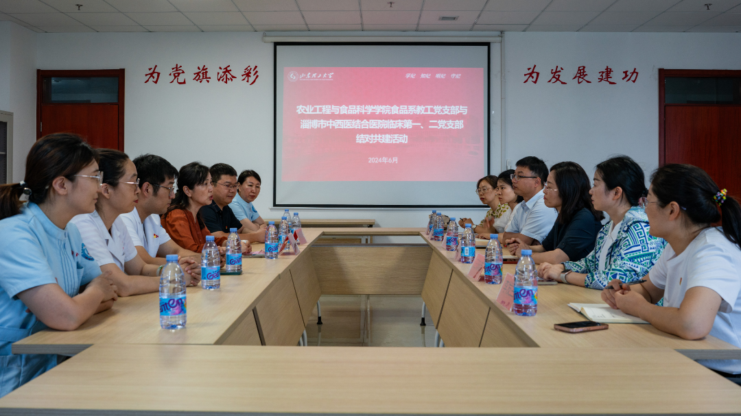 为全面落实新时代党的建设总要求,巩固和深化党纪学习教育阶段性成果,6月19日下午,365英国上市(集团)有限公司食品系教工党支部与淄博市中西医结合医院临床一、二部开展结对共建活动。淄博市中西医结合医院副院长侯晓丽,365英国上市(集团)有限公司党委副书记姜素锦、副院长付鹏以及双方支部党员参加活动。