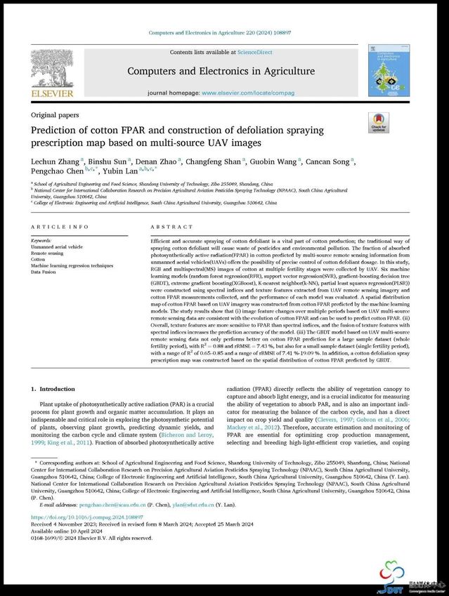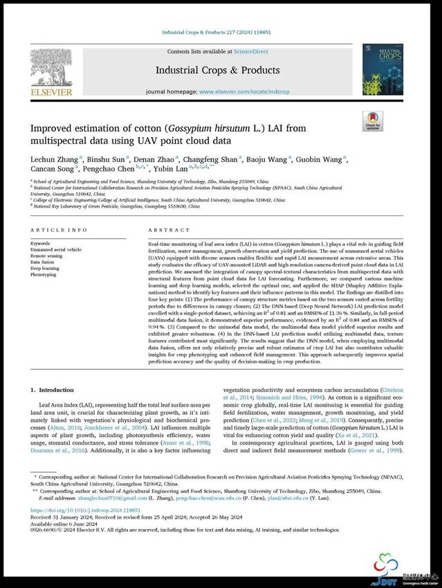 近日,我校精准农业航空团队在棉花生理学参数遥感反演方面取得新成果,在中科院一区Top期刊以农业工程与食品科学学院为第一单位、硕士研究生张乐春为第一作者发表2篇论文,团队首席科学家兰教授为通讯作者。
