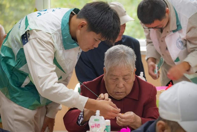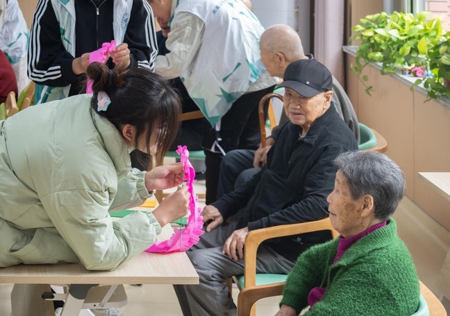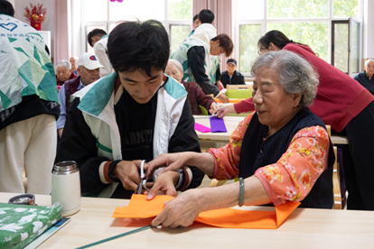 活动开始前,志愿者首先向老人们介绍了重阳节的传统习俗和赏菊风俗的来历,并详细讲解了衍生菊花的制作步骤。志愿者们通过生动的语言引导老人们,将手中的皱纹纸变成一朵朵栩栩如生的菊花。老人们兴致勃勃地参与进来,一边听着志愿者的讲解,一边小心翼翼地剪裁、粘贴,一朵朵形态各异的菊花在他们手中绽放。在制作衍生菊花的过程中,志愿者们还与老人们亲切交谈,询问他们的身体状况和生活情况,倾听他们的心声。老人们也向志愿者们分享了自己的生活经历和人生感悟,现场气氛温馨而融洽。活动最后,志愿者们还向老人们送上了真挚的祝福,祝愿他们身体健康、生活幸福。