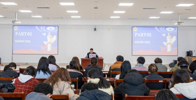 韩警官结合校园真实案例网络交易诈骗风险与防范、校园纠纷与防范、物品遗失与防范、诈骗风险与防范、学术诚信与防范、隐私安全与防范、恋情纠纷隐私保护、翻墙行为风险与防范八方面,针对大学校园安全突出问题进行了深入讲解,引导同学们做到心有法度、行有尺度,自觉抵制外界诱惑、规范自身言行,做知法、懂法、守法的合格大学生。