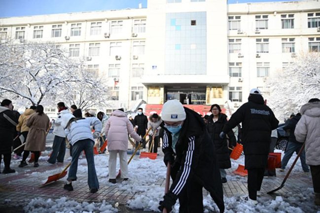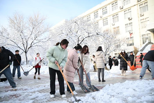 3月3日,为保障在校大学生校园出行安全,弘扬志愿服务精神,学院教职工、学生党员、学生干部、学生会志愿者开展“破冰迎春,志愿同行”校园扫雪行动。活动重点清扫教学楼、台阶坡道等易滑区域。志愿者们分工协作,手持铁锹、雪铲、扫帚等工具,高效清除路面积雪,确保大学生出行安全,出入教学楼通行无阻。