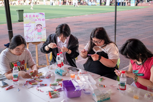 “发间彩虹工作坊”提供奶油胶、基础发卡及各种正能量符号配饰。同学们自由设计制作个性化发卡,将美好寓意融入创作中。完成后,许多人选择佩戴或赠送给朋友,传递温暖与祝福。手工制作的过程不仅缓解了压力,还增强了自我认同感。