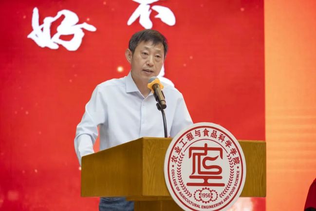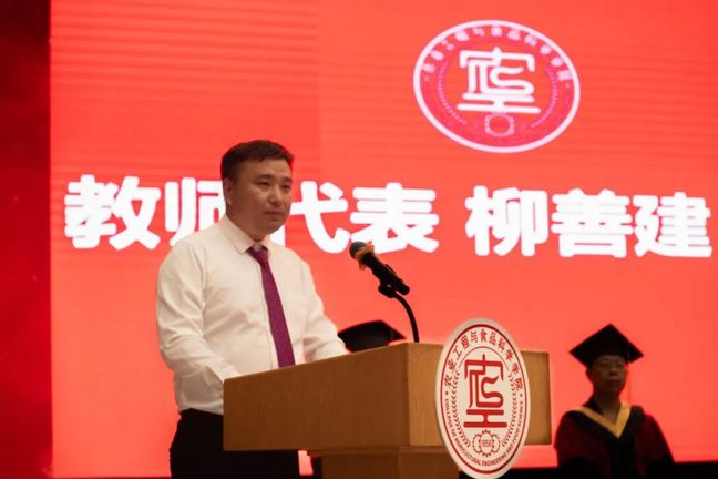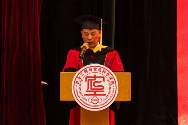 新能源科学与工程系柳善建代表教师发言,他结合各专业特点勉励毕业生以专业为基石、以信念为灯塔,在智慧农业、食品健康、绿色能源、创意设计行业为国家与社会贡献力量,他寄语学生要永葆生物质转化过程中“破壳重生”的勇气,保持“能量级联利用”的思维方式,拥有“碳中和”一样的人生态度,坚守初心做有担当的“农工人”。