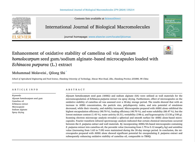 2024年11月,Mohammad Molaveisi在“International Journal of Biological Macromolecules (IF 8.5)”发表了题为“Enhancement of oxidative stability of camelina oil via Alyssum homolocarpum seed gum/sodium alginate–based microcapsules loaded with Echinacea purpurea (L.) extract”的研究类文章。该文以海藻酸钠和AHSG为亲水性乳化剂,系统研究了负载紫锥菊提取物的双层乳液的制备、表征;采用喷雾干燥对该双层乳液进行微胶囊制备并表征;最后,深入探究微胶囊包埋物对菜籽油氧化稳定性的保护效果及机理。
