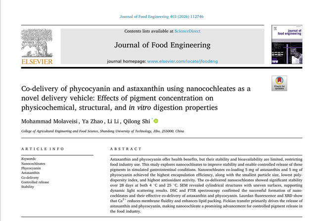 2025年9月,Mohammad Molaveisi在食品工程领域权威期刊“Journal of Food Engineering (IF 5.8)”发表了题为“Co-delivery of phycocyanin and astaxanthin using nanocochleates as a novel delivery vehicle: Effects of pigment concentration on physicochemical, structural, and in vitro digestion properties”的研究类文章,系统阐述了色素浓度对负载藻蓝蛋白和虾青素等2种色素的纳米脂质卷递送载体理化特性、微观结构和体外模拟释放动力学和机制的影响。本研究不仅为亲水性和疏水性活性成分的共递送纳米载体的构筑提供了一种安全、便捷的方法,而且对功能性或强化性食品的开发具有重要的借鉴作用。