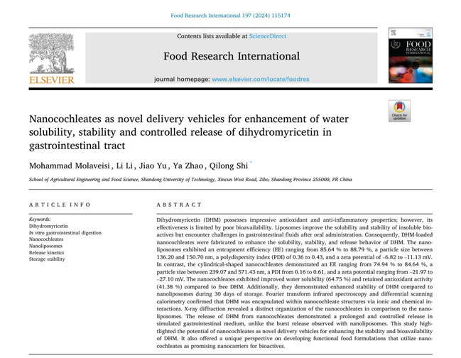 2024年12月,Mohammad Molaveisi在“Food Research International (IF 8.0)”发表了题为“Nanocochleates as novel delivery vehicles for enhancement of water solubility, stability and controlled release of dihydromyricetin in gastrointestinal tract”的研究类文章。系统研究了纳米脂质卷作为一种新颖的递送载体,对包埋二氢杨梅素其水溶性、稳定性和模拟胃肠道中的释放性能的影响和机制。本研究成果首次报道纳米脂质卷可作为靶向递送载体在非水溶性活性成分微胶囊包埋中应用。