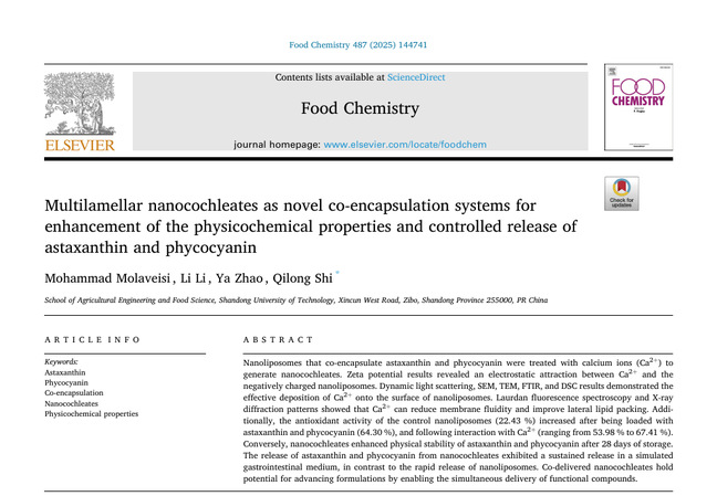 2025年9月,Mohammad Molaveisi在食品科学领域权威期刊“Food Chemistry (IF 9.8)”发表了题为“Nanocochleates as novel delivery vehicles for enhancement of water solubility, stability and controlled release of dihydromyricetin in gastrointestinal tract”的研究类文章。系统探究了纳米脂质体和纳米脂质卷作为新颖递送载体,共载藻蓝蛋白和虾青素的理化特性、控制释放动力学和机制。本论文成果为共载亲水性成分(藻蓝蛋白)和疏水性成分(虾青素)提供了一种新颖的靶向递送载体,有望为功能性食品开发提供新思路和新途径。