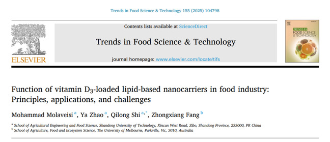 2025年1月,Mohammad Molaveisi在食品科学与工程领域权威综述类期刊“Trends in Food Science & Technology (IF 15.4)”发表了题为“Function of vitamin D3-loaded lipid-based nanocarriers in food industry: Principles, applications, and challenges”的综述类文章。系统阐述了负载VD3的脂基纳米载体在食品工业中的作用、原理、应用和挑战。本论文成果实现了我校在食品领域综述类顶级期刊中零的突破。