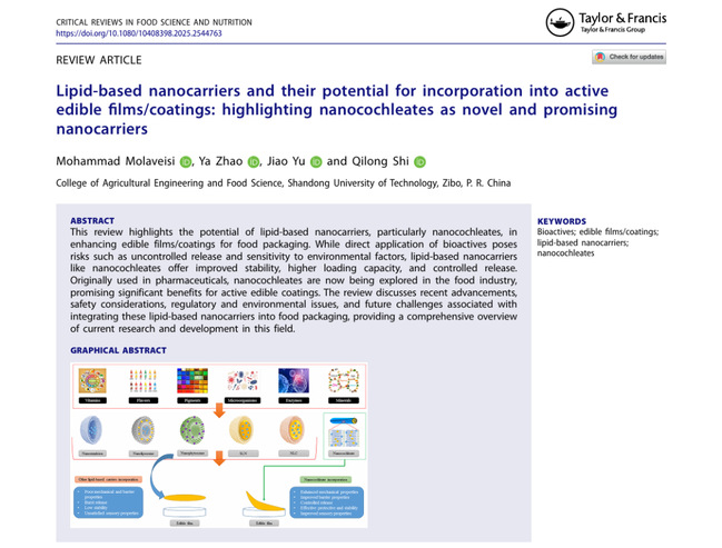 2025年8月,Mohammad Molaveisi在“Critical Reviews in Food Science and Nutrition (IF 8.8)”发表了题为“Lipid-based nanocarriers and their potential for incorporation into active edible films/coatings: Highlighting nanocochleates as novel and promising nanocarriers”的综述类文章。系统阐述了脂基纳米载体尤其纳米脂质卷在可食性膜/涂层中的应用进展、安全问题、相关法律法规、环境影响和未来挑战。我校师生首次在该期刊上报道相关成果。