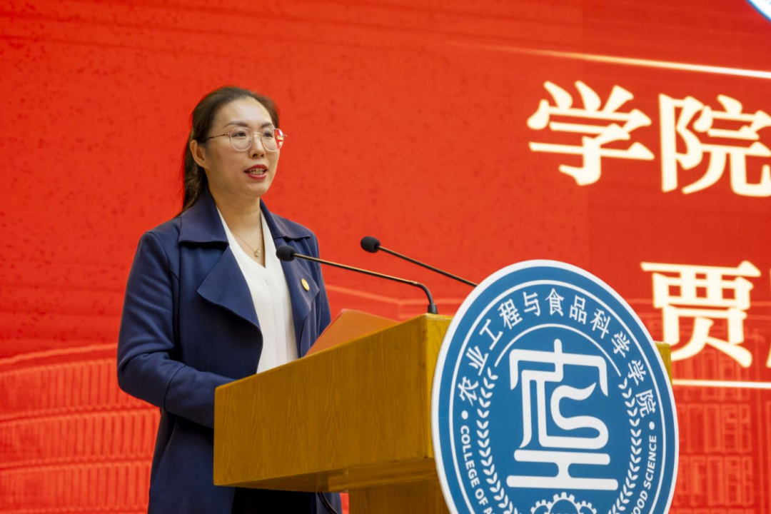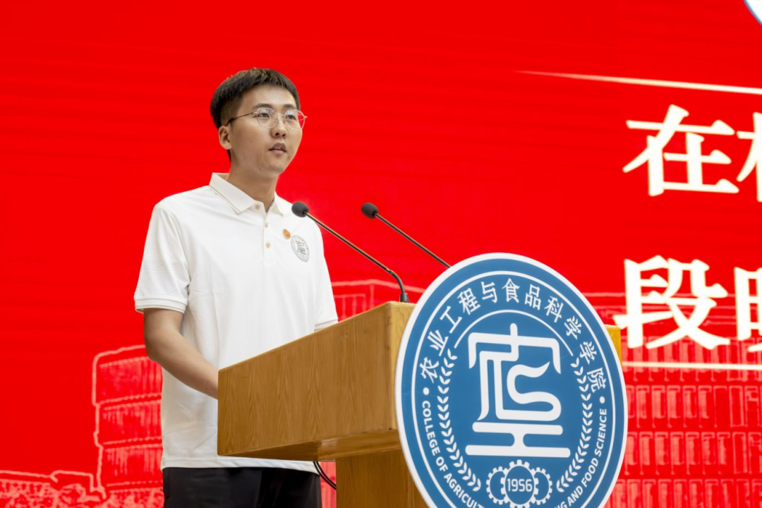 在校生代表硕2301班段晓宁分享“学在山东理工,拼在农工学院”的体悟,结合自身经历激励新生要立志为先,做胸怀国之大者的新时代青年;要勤学笃行,做本领过硬的科研青年;要知行合一,做全面发展的斜杠青年。