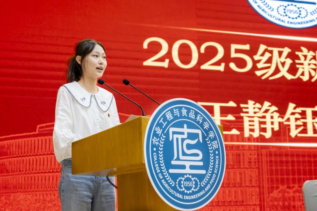 新生代表农机2501班王静钰代表全体新生感谢学院领导、老师、学长学姐的悉心指导。她通过回忆迎新现场看到的智能农业装备、了解到的各专业发展前景,表达了对未来在农工学院学习生活的美好期待,呼吁全体新生要扎实学习理论知识,俯身实践,练就过硬本领。