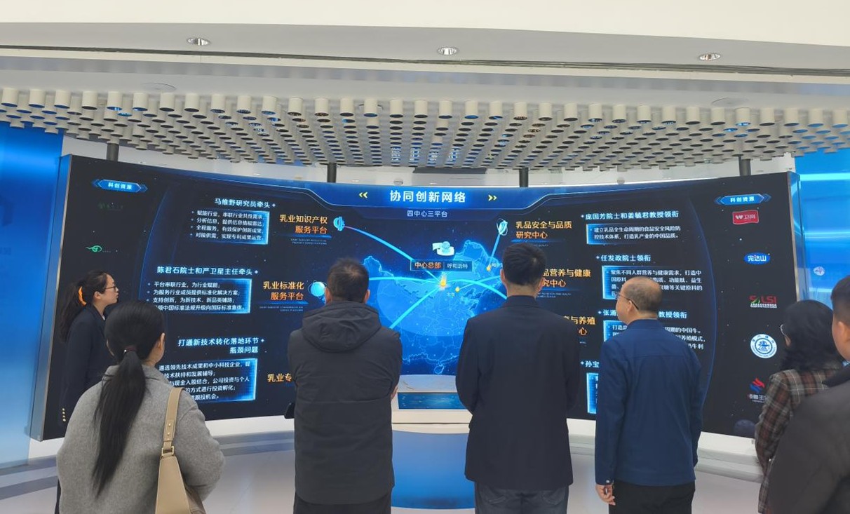 在协同创新网络展区,师生系统学习了以“四中心三平台”为核心的乳业协同创新体系。该体系整合“乳品安全与品质、乳品营养与健康、奶牛繁育与养殖、乳业工艺技术与装备”四大研究中心与“乳业知识产权服务、乳业标准化服务、乳业专业孵化”三大服务平台,形成从前沿技术研发到成果转化孵化的完整生态,为乳业全产业链的科技赋能与高质量发展提供系统支撑。