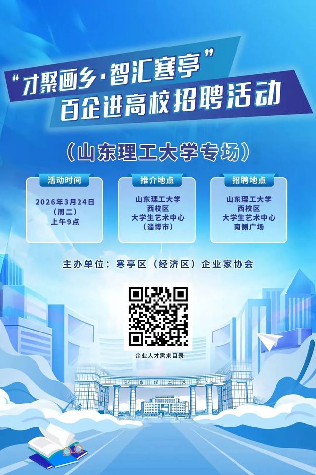 才聚画乡·智汇寒亭”百企进高校招聘活动(山东理工大学专场)即将启动!寒亭区携多家重点企业及优质岗位走进山理工,旨在为学子们搭建高效、精准的就业对接平台。现诚邀各位同学踊跃参与,把握机遇,在这里找到心仪的 career 起点!